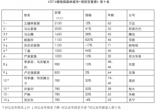 2016胡润百富榜:首富还是王健林马云马化腾位列二三名