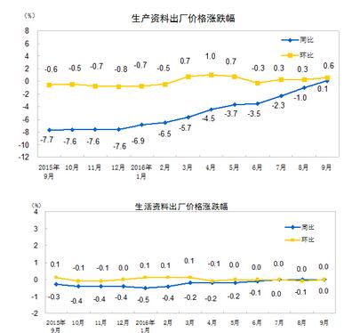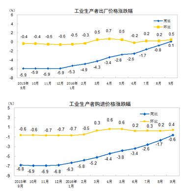 2016年9月份,全国工业生产者出厂价格环比上涨0.5%,同比上涨0.1%,同比是自2012年3月份以来首次由负转正。工业生产者购进价格环比上涨0.4%,同比下降0.6%。1-9月平均,工业生产者出厂价格同比下降2.9%,工业生产者购进价格同比下降3.8%。