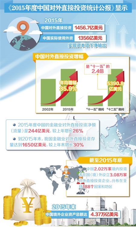 中国对外直接投资交出亮丽成绩单。日前,商务部、国家统计局、国家外汇管理局在国新办新闻发布会上正式发布《2015年度中国对外直接投资统计公报》(以下简称《公报》)。《公报》显示,2015年中国对外直接投资创下1456.7亿美元的历史新高,占全球流量的份额由2002年的0.4%提升至9.9%,投资流量跃居全球第二。