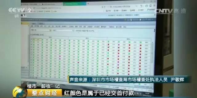 深圳市市场稽查局市场稽查处执法人员 尹敬辉:绿颜色属于待售状态,红颜色是已经交首付款,粉红色是交了定金,签了认购书,在这一栏会显示项目总计是814套,目前在售状态的是有355套,所以从这里显示出来的真实的销售情况,与员工内部培训那张表单上显示“整理出10套稀缺的房源” “房源非常紧张”的情况是不符的。