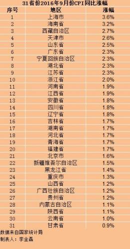 在31个省份中,上海9月份CPI涨幅全国最高,为3.6%,涨幅比8月回升0.6个百分点。数据显示,上海CPI涨幅自今年3月份开始已连续7个月处于“3时代”。