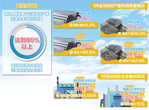 截至9月底,钢铁、煤炭两个行业退出产能均已完成全年目标任务量的80%以上,部分地区和中央企业已经提前完成全年任务。