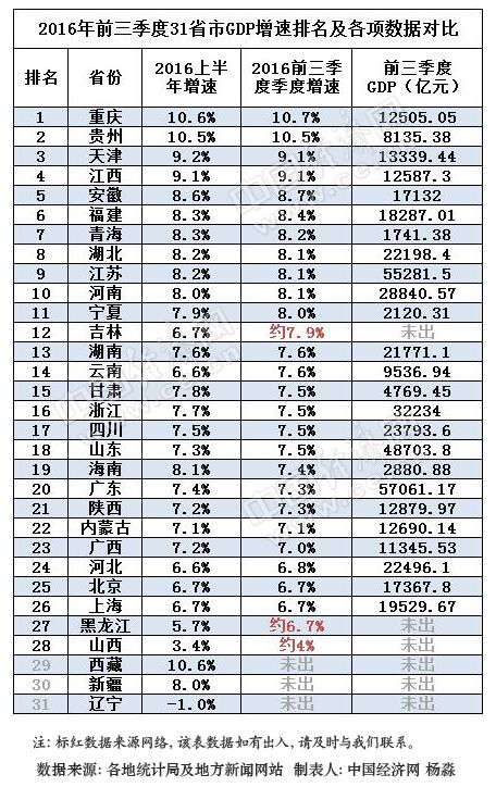 2016年前三季度31省区GDP增速排行榜。(持续更新......)