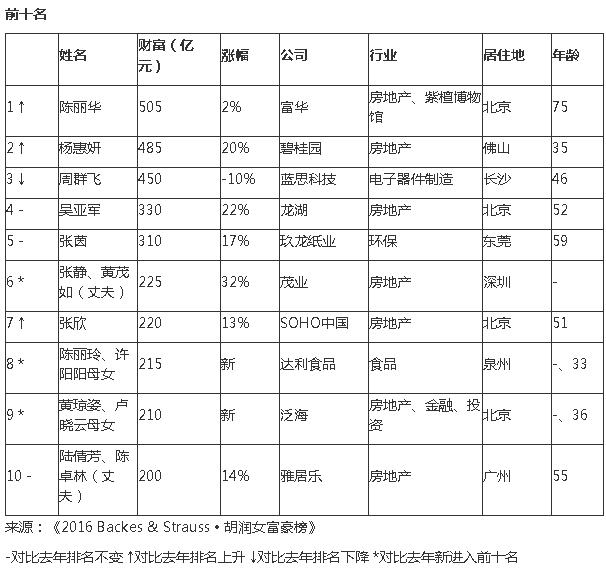 10月25日电 据胡润百富官方网站消息,胡润研究院今日发布了《2016胡润女富豪榜》。数据显示,北京地产女王,75岁的陈丽华以505亿元财富首次成为中国女首富,杨惠妍、周群飞位居第二、第三位。