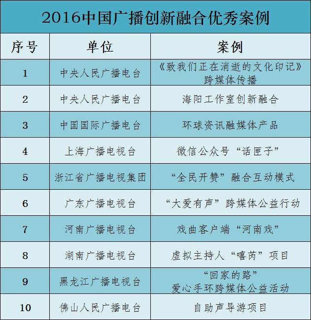 10月25日,2016上海广播节·中国广播创新融合案例发布。这些从全国近50家省市级电台提供的240多个案例中评选产生的优秀案例,或从技术突破,或从市场入手,或从体制转变,推动着中国广播的融合转型发展,形成一股创新融合的力量。今天,我们一起分享这些典型优秀案例的成功经验和有益探索。