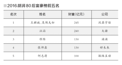 京华时报讯(记者胡笑红)胡润研究院昨天发布《2016胡润80后富豪榜》,这是胡润研究院首次发布此榜单,内容包括《80后白手起家富豪榜》和《80后财富继承富豪榜》两个部分,榜单财富计算的截止日期为今年8月15日。