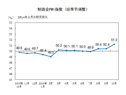 11月1日,国家统计局网站公布10月份中国制造业采购经理指数(PMI)为51.2%,比上月上升0.8个百分点,在临界点之上明显回升,创2014年7月以来数值新高。