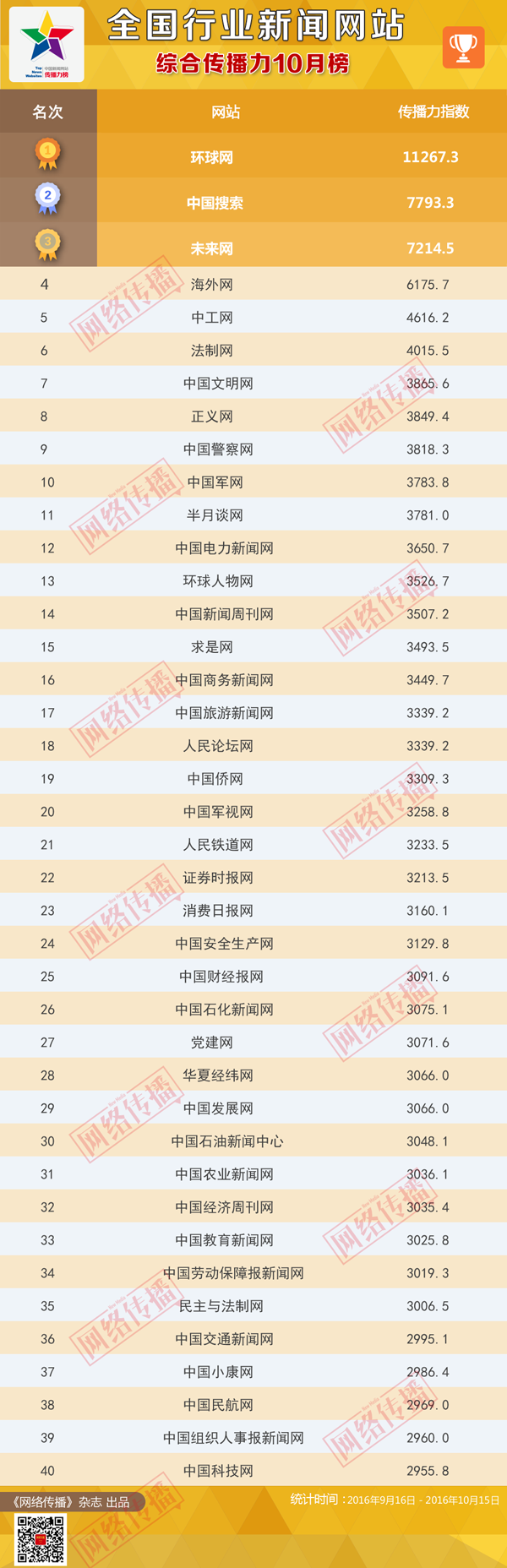 中央网信办《网络传播》杂志倾力打造的“全国行业新闻网站传播力2016年10月榜”今日正式发布。