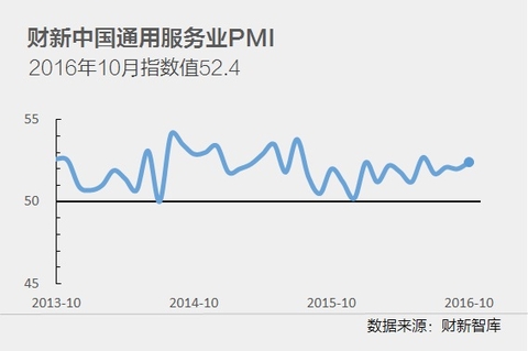 11月3日发布的10月财新中国通用服务业经营活动指数(服务业PMI)录得52.4,高出9月0.4个百分点,为四个月以来最高。