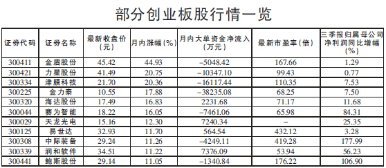 市场研究中心统计显示,11月份以来,共有350只创业板成份股实现上涨,占创业板可交易个股总数的69.17%,剔除今年10月份以来首发上市次新股后,共有24只创业板股月内涨幅超10%,金盾股份(44.93%)、宝色股份(31.85%)、田中精机(23.94%)、力星股份(20.75%)、津膜科技(20.36%)等个股月内涨幅超20%。