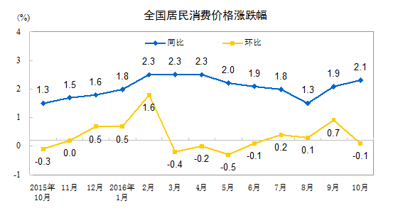 北京11月9月讯 据国家统计局网站消息,2016年10月份,全国居民消费价格总水平同比上涨2.1%。其中,城市上涨2.2%,农村上涨1.8%;食品价格上涨3.7%,非食品价格上涨1.7%;消费品价格上涨1.9%,服务价格上涨2.5%。1-10月平均,全国居民消费价格总水平比去年同期上涨2.0%。