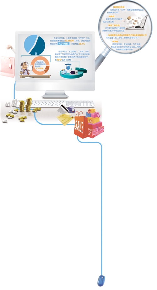 和先涨价再打折相比,假冒伪劣商品更令消费者头疼。数据显示,今年1至10月,上海市工商局“12315”中心共受理消费者投诉15.81万件,同比增长17.6%;其中,涉及网络购物的投诉7.24万件,同比增长58.1%,反映网购商品质量问题的投诉1.11万件,占网购投诉的15.3%。在此前对1号店、东方购物、飞牛网、京东商城等7个网络平台销售的62个批次电烤箱、面包机等厨房小家电和洗衣机质量抽检中,有16个批次不合格,不合格检出率高达25.8%。