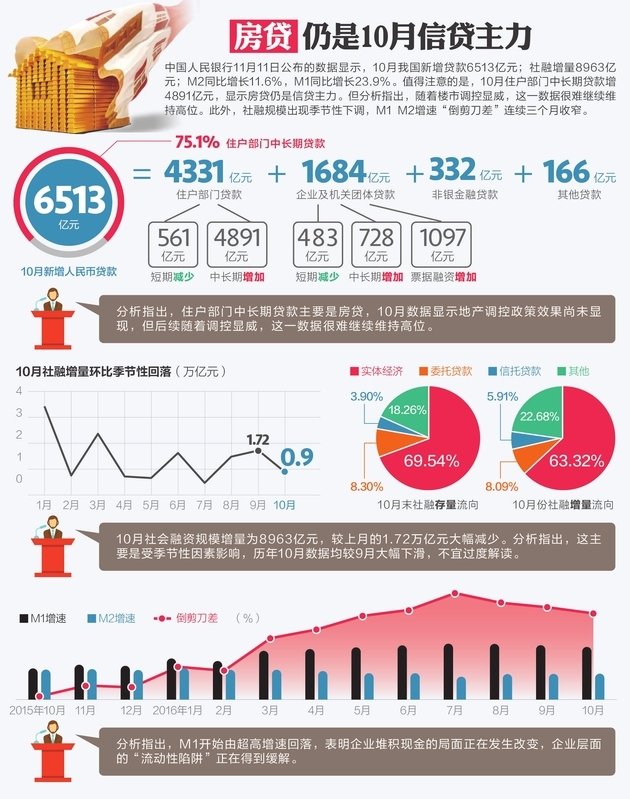 中国人民银行11月11日公布的数据显示,10月我国新增贷款6513亿元;社融增量8963亿元;M2同比增长11.6%, M1同比增长23.9%。值得注意的是,10月住户部门中长期贷款增4891亿元,显示房贷仍是信贷主力。但分析指出,随着楼市调控显威,这一数据很难继续维持高位。此外,社融规模出现季节性下调,M1月M2增速“倒剪刀差”连续三个月收窄。