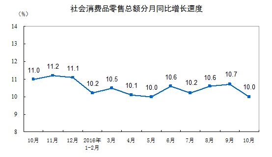 2016年10月份,社会消费品零售总额31119亿元,同比名义增长10.0%(扣除价格因素实际增长8.8%,以下除特殊说明外均为名义增长)。其中,限额以上单位消费品零售额13508亿元,增长7.5%。
