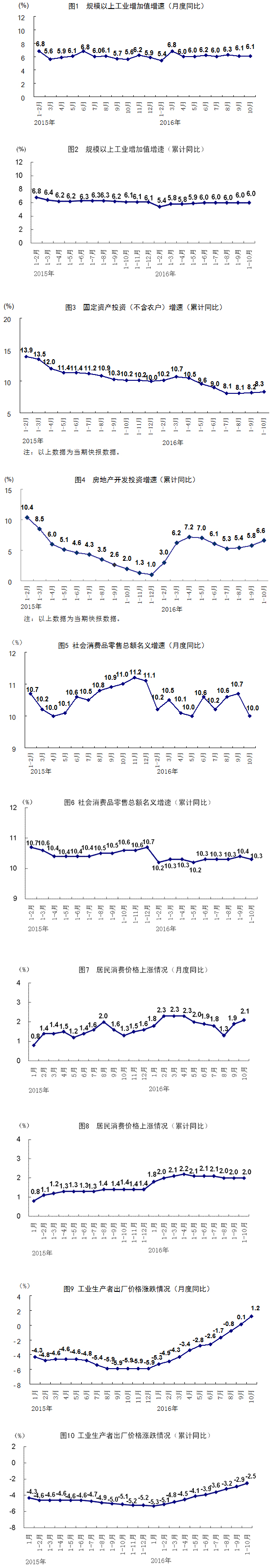 10月份,全国规模以上工业增加值按可比价格计算同比增长6.1%,增速与上月持平,比上年同期加快0.5个百分点。分经济类型看,国有控股企业增加值同比增长3.2%,集体企业下降3.8%,股份制企业增长6.8%,外商及港澳台商投资企业增长4.8%。分三大门类看,采矿业增加值同比下降2.2%,制造业增长6.7%,电力、热力、燃气及水生产和供应业增长7.9%。工业结构继续优化,高技术产业和装备制造业增加值同比分别增长10.5%和10.1%,增速分别比规模以上工业快4.4和4.0个百分点。规模以上工业企业产销率达到97.9%。从环比看,10月份全国规模以上工业增加值比上月增长0.50%。1-10月份,规模以上工业增加值同比增长6.0%。