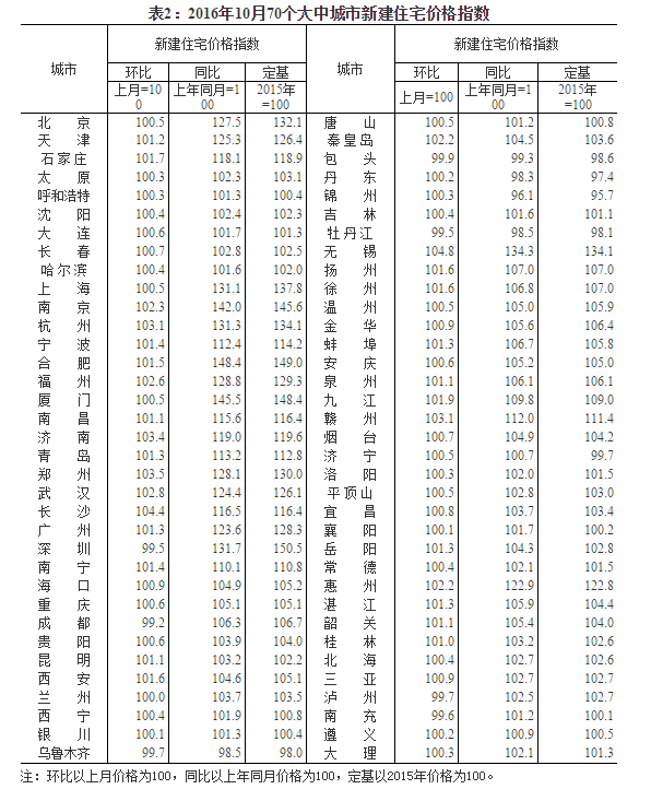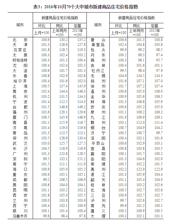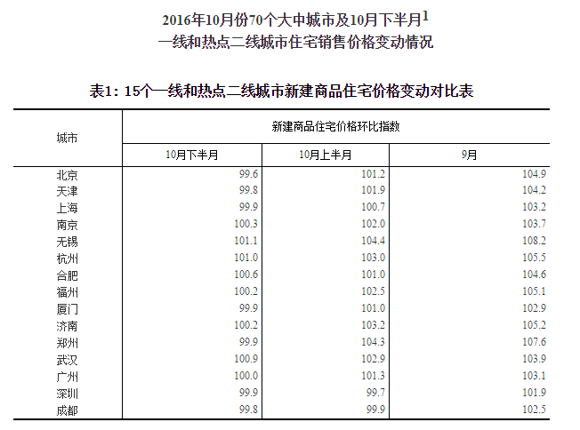 为深入反映房地产市场动态变化,国家统计局继上月统计发布15个一线和热点二线城市10月上半月房价变动情况后,又对这些城市10月下半月的房价变动情况进行了统计。结果显示,一线和热点二线城市因地制宜、因城施策实施调控政策以来,房价走势明显趋稳。与10月上半月比,10月下半月新建商品住宅价格除深圳和成都2个城市继续下降外,北京、天津、上海、厦门和郑州等5个城市也由升转降,降幅在0.1至0.4个百分点之间;广州新建商品住宅价格环比持平;其余7个城市新建商品住宅价格环比涨幅进一步回落,回落幅度在0.4至3.3个百分点之间。
