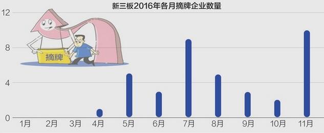 算上昌盛日电,本月已有10家公司摘牌,虽然还未到12月,但是对比历史情况看,这一摘牌数字已是新三板历史上的单月最大值。根据Choice数据显示,截至2016年11月21日,已经有74家企业摘牌,其中2016年已经有38家摘牌。