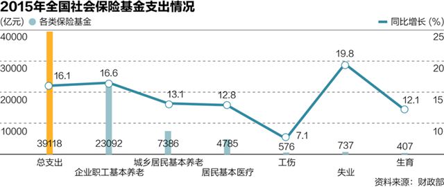 于洪告诉记者,2015年,社会保障和就业支出19001亿元,同比增长16.9%,占财政总支出的比重已连续三年超过10%。其中,中央负担4.38%,地方负担95.62%。这笔钱主要用于对社会保险基金的补助,包括行政事业单位离退休、就业补助、城市居民最低生活保障、自然灾害生活救助、农村最低生活保障等项目。