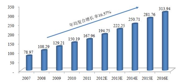 2007-2016年全球网络游戏市场规模( 单位:亿美元)