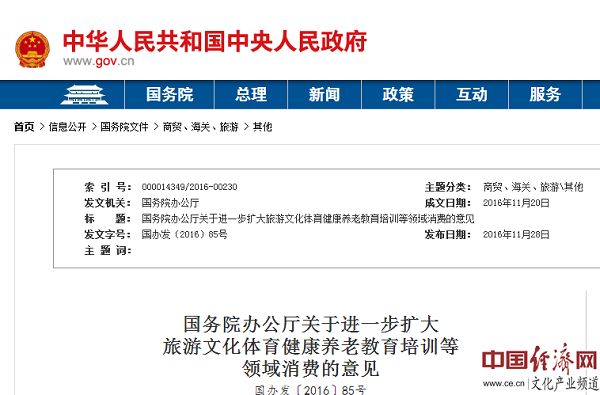 北京11月29日讯 据中国政府网11月28日消息,国务院办公厅发布关于进一步扩大旅游文化体育健康养老教育培训等领域消费的意见(以下简称意见)。据中国经济网文化产业频道(微信号:中经文化产业)了解,意见指出,围绕旅游、文化、体育、健康、养老、教育培训等重点领域,引导社会资本加大投入力度,通过提升服务品质、增加服务供给,不断释放潜在消费需求。