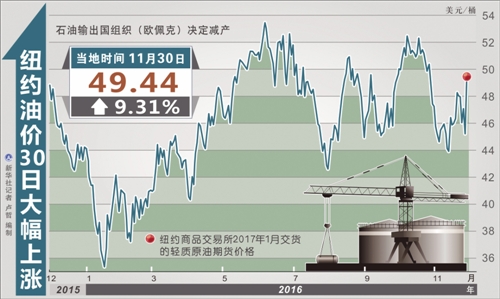 受欧佩克减产协议提振,国际原油市场出现了强劲反弹。截至当天收盘,纽约商品交易所2017年1月交货的轻质原油期货价格上涨4.21美元,收于每桶49.44美元,涨幅为9.31%。2017年1月交货的伦敦布伦特原油期货价格上涨4.09美元,收于每桶50.47美元,涨幅为8.82%。分析人士认为,欧佩克减产的重要意义,除了实际减少产量之外,更重要的是欧佩克为国际原油市场明确了未来一段时间的走势。
