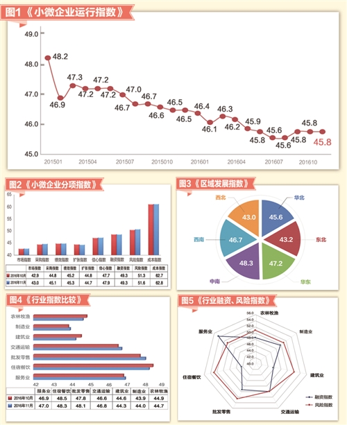 2016年11月份,“经济日报—中国邮政储蓄银行小微企业运行指数”(见图1)为45.8,与上月持平,表明本月小微企业依旧保持平稳运行。