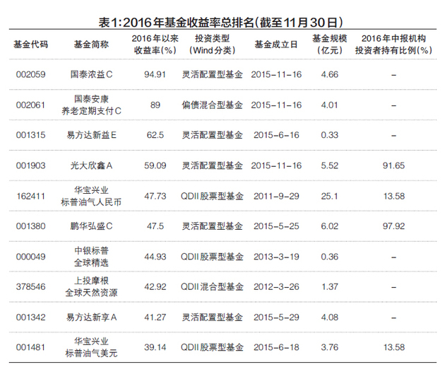 今年还有一类基金不容小觑,那就是QDII。截至11月30日,排名前三的华宝兴业标普油气人民币、中银标普全球精选、上投摩根全球天然资源今年以来收益率都超过了40%,一扫QDII过往业绩阴霾。