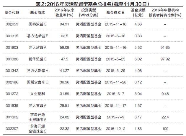 从分类排名来看(见表2和表3),灵活配置型基金今年可谓牛基辈出,排名前五的收益率均超过40%,其中排名第一的国泰浓益C收益率高达94.91%,直接将市场上所有基金挑落马下。排名第二的易方达新益E与其相差32个百分点,国泰浓益C已稳坐冠军。