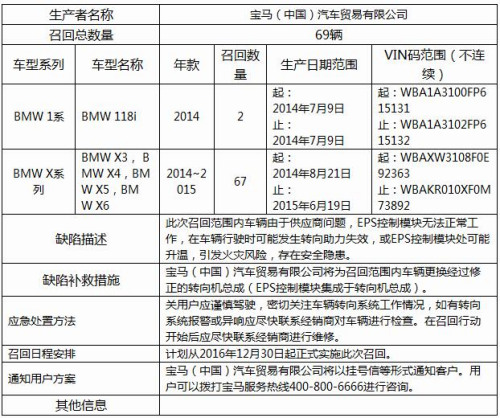 据国家质检总局网站消息,宝马(中国)汽车贸易有限公司近日召回2辆进口宝马1系及67辆X系列汽车。召回车辆存在安全隐患,宝马公司计划从2016年12月30日起正式实施此次召回,并将以挂号信等形式通知客户。