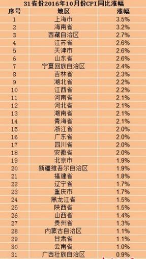 在31个省份中,上海10月份CPI涨幅全国最高,为3.5%,涨幅比9月回落0.1个百分点。其次是海南,涨幅为3.2%。上海、海南也是目前全国两个CPI涨幅处于“3时代”的地区。