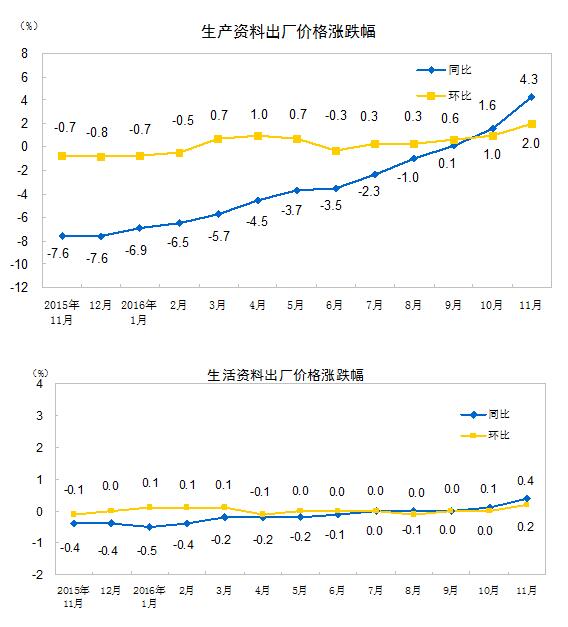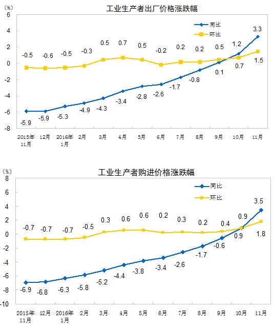 北京12月9日讯 据统计局网站消息,2016年11月份,全国工业生产者出厂价格环比上涨1.5%,同比上涨3.3%。工业生产者购进价格环比上涨1.8%,同比上涨3.5%。1-11月平均,工业生产者出厂价格同比下降2.0%,工业生产者购进价格同比下降2.7%。