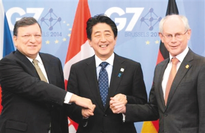 图为此前日本首相安倍晋三(中)在欧盟总部与欧洲理事会主席范龙佩(右)、欧洲委员会主席巴罗佐(左)会面。资料图片