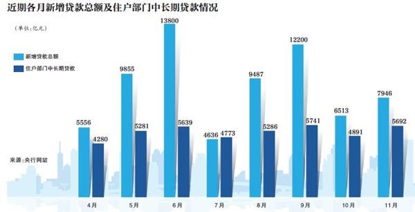在今年下半年不少城市出台限购措施后,代表个人住房贷款的住户部门中长期贷款依旧在新增贷款中占据较高的比例。根据央行披露的数据,11月份住户部门贷款增加6796亿元,其中短期贷款增加1104亿元,中长期贷款增加5692亿元,占到新增贷款7946亿元的71.6%。