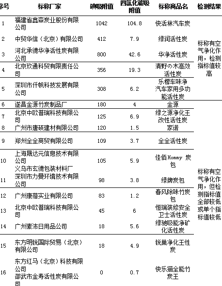 因活性炭有吸附功能,很多商家标称活性炭具有除甲醛、室内异味等功能。但是,室内活性炭没有国家标准,也没有行业标准。中国消费者协会根据消费者的反映情况,随机选取16个活性炭样品和4个火锅碳样品,委托专业检测机构,对活性炭的碘吸附值和四氯化碳吸附值两项指标提请检测,检测结果显示有的活性炭检测指标数值较低,有的甚至不如普通的火锅炭。有些标称空气净化功能样品的检测结果相对较好,但是消费者也应注意,活性炭的吸附功能是有上限的,如果活性炭量一定并且不通风,一定时间后,吸附功能就会下降,因此需要定期更换。