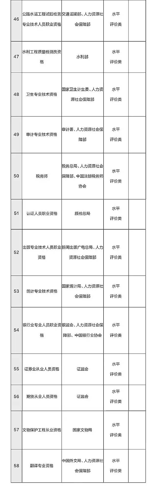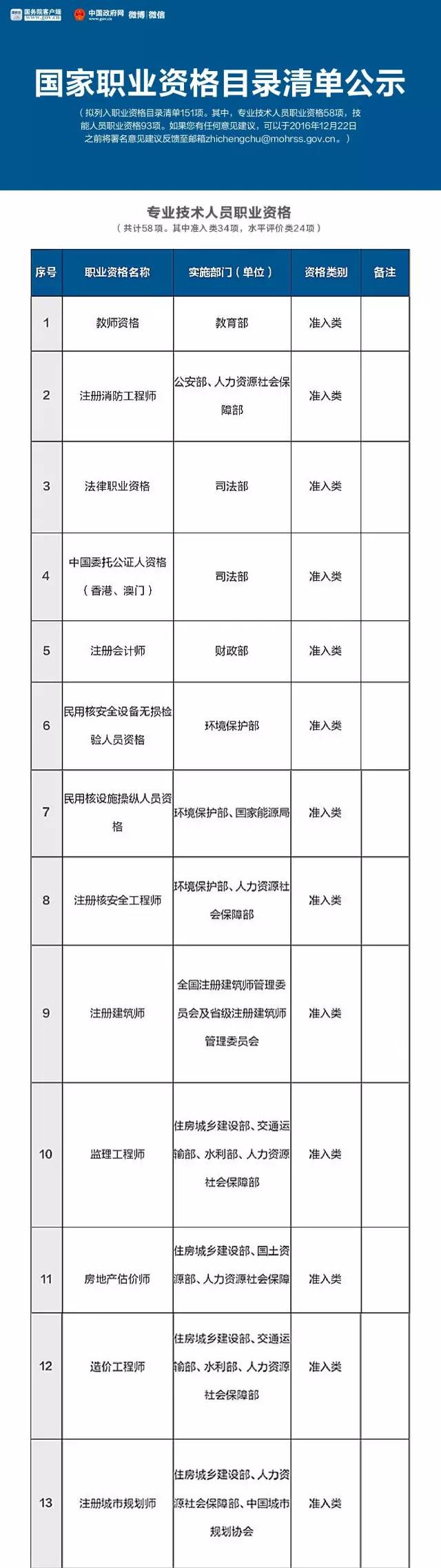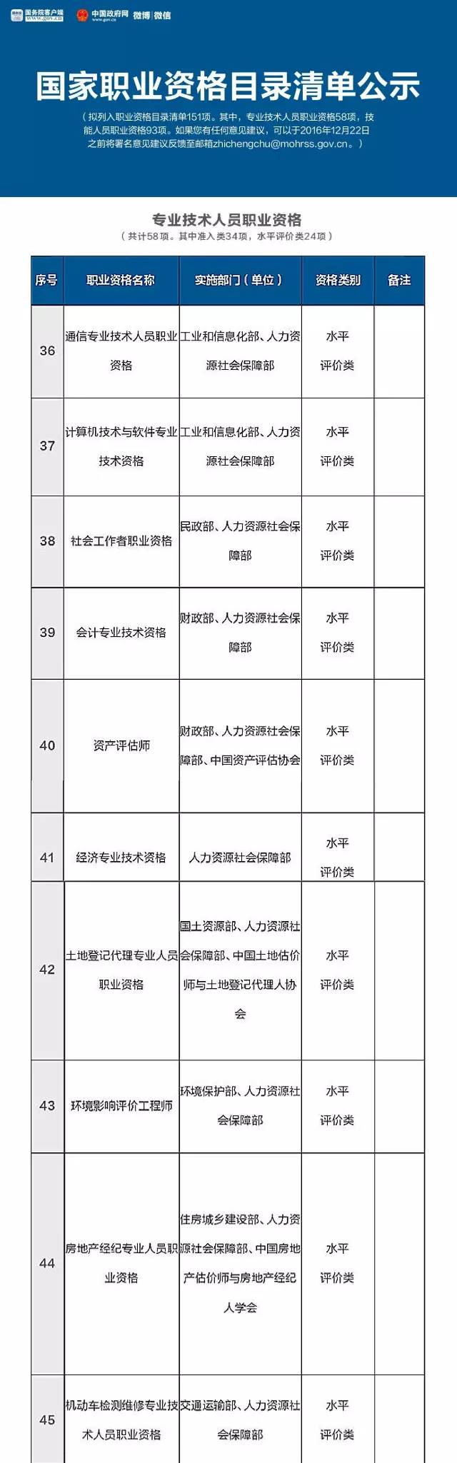 就在这个月的16号,人力资源和社会保障部公示了 国家职业资格目录清单,拟列入职业资格目录清单151项。其中,专业技术人员职业资格58项,技能人员职业资格93项。