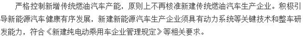 《通知》第四条指出,“严格控制新增传统燃油汽车产能,原则上不再核准新建传统燃油汽车生产企业。积极引导新能源汽车健康有序发展,新建新能源汽车生产企业须具有动力系统等关键技术和整车研发能力,符合《新建纯电动乘用车企业管理规定》等相关要求。”