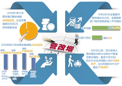 据悉,自5月1日全面推开营改增试点以来,四大新增试点行业的新办户数逐月稳步增加,截至11月30日,四大行业试点纳税人共计1069万户,比5月初的1011万户增加了58万户。
