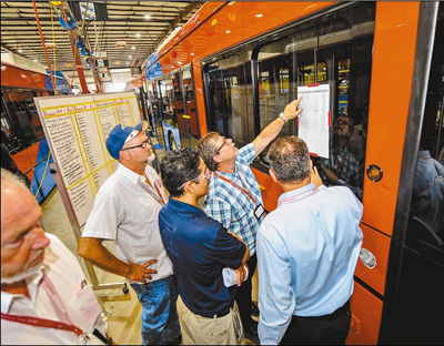 比亚迪公司在洛杉矶北部兰开斯特设立了第一家电动大巴工厂和动力电池工厂。依靠电池领域的核心技术和强大的整体组装能力,比亚迪电动大巴目前在美国市场几乎没有竞争对手。公司将继续扩大其美国电动汽车工厂规模。图为在比亚迪公司位于美国兰开斯特的工厂内,工作人员审核验收大巴。