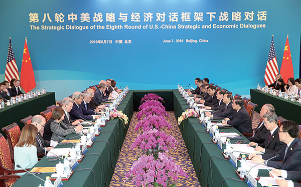 2016年6月6日至7日在北京举行的第八轮期间,中国国家主席习近平的特别代表国务委员杨洁篪与美国总统贝拉克·奥巴马的特别代表国务卿约翰·克里共同主持了战略对话,两国政府有关部门负责人参加。双方就重大双边、地区和全球性问题深入交换意见,并就78项成果达成一致。中美双方积极评价近年来中美关系取得的进展。双方决定继续按照两国元首达成的共识,拓展合作,缩小分歧,推进中美新型大国关系建设。双方积极评价中美元首在第四届核安全峰会期间会晤取得的成果。两国元首期待在二十国集团杭州峰会期间会晤,重申希望杭州峰会取得成功。双方将保持高层交往,继续用好中美战略与经济对话、中美人文交流高层磋商、中美商贸联委会、中美打击网络犯罪及相关事项高级别联合对话等富有成效的机制。双方将就双边、地区和全球性问题保持密切沟通,推动取得新的务实成果,造福两国和世界人民。