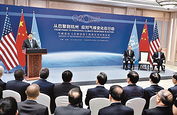 2016年9月3日,中国国家主席习近平同美国总统奥巴马、联合国秘书长潘基文在杭州共同出席气候变化《巴黎协定》批准文书交存仪式。习近平在致辞中指出,气候变化关乎人民福祉和人类未来。《巴黎协定》为2020年后的全球合作应对气候变化明确了方向,标志着合作共赢、公正合理的全球气候治理体系正在形成。奥巴马在致辞中表示,美中两国为推动国际合作、促成《巴黎协定》共同发挥了重要作用。今天,美中作为两个最大经济体和最大排放国,同时批准和接受《巴黎协定》具有历史性意义。潘基文在致辞中表示,中美率先批准《巴黎协定》,将极大推动该协定于今年内生效。联合国高度赞赏中美两国在应对气候变化挑战方面发挥的领导作用。富有雄心的《巴黎协定》将为全球提供可持续发展新的稳定框架,将为我们共同的家园提供安全保护。《巴黎协定》于2015年12月12日在气候变化巴黎大会上通过。2016年4月22日,中美同时签署《巴黎协定》。