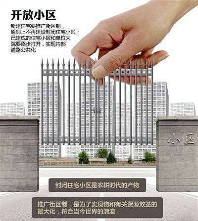 2016年2月21日,《中共中央国务院关于进一步加强城市规划建设管理工作的若干意见》公布,这是时隔37年重启的中央城市工作会议的配套文件, 勾画了“十三五”乃至更长时间中国城市发展的“路线图”。其中最引人瞩目的就是我国新建住宅要推广街区制,原则上不再建设封闭住宅小区的内容。该《意见》指出,已建成的住宅小区和单位大院要逐步打开,实现内部道路公共化,解决交通路网布局问题,促进土地节约利用。另外要树立“窄马路、密路网”的城市道路布局理念,建设快速路、主次干路和支路级配合理的道路网系统。