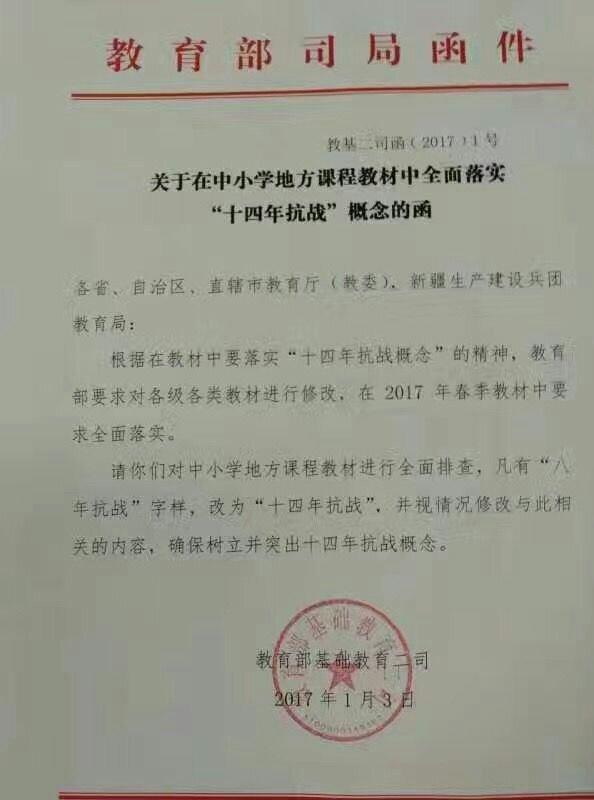 《函件》表示,根据在教材中要落实“十四年抗战概念”的精神,教育部要求对各级各类教材进行修改,在2017年春季教材中全面落实。