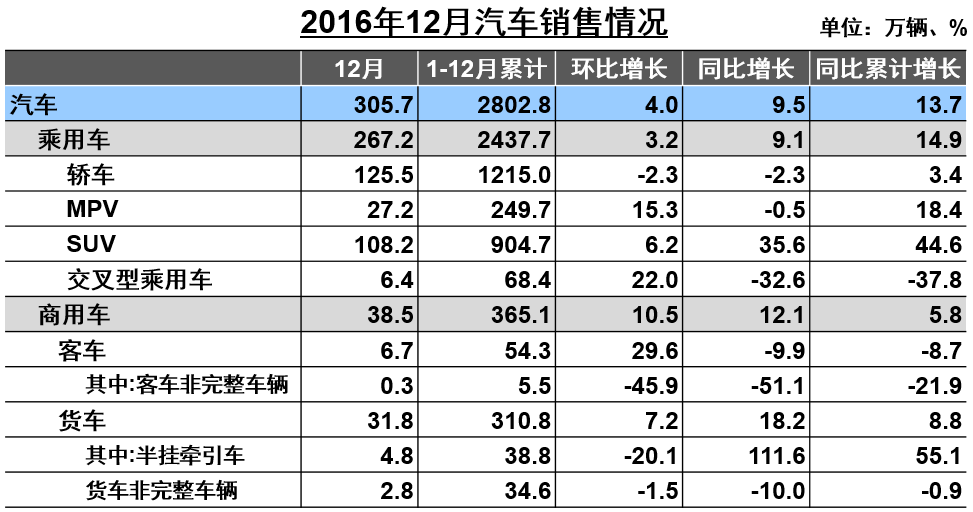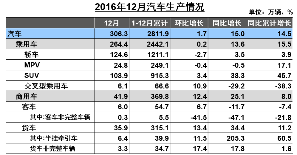数据显示,2016年我国汽车产销分别完成2811.9万辆和2802.8万辆,比上年同期分别增长14.5%和13.7%,高于上年同期11.2和9.0个百分点。12月,汽车生产306.28万辆,环比增长1.73%,同比增长15.04%;销售305.73万辆,环比增长4.04%,同比增长9.47%。月度销量除2月份以外,其余月份均明显高于上年同期,销量累计增长率呈“直线上升”走势,总体呈现产销两旺发展态势。