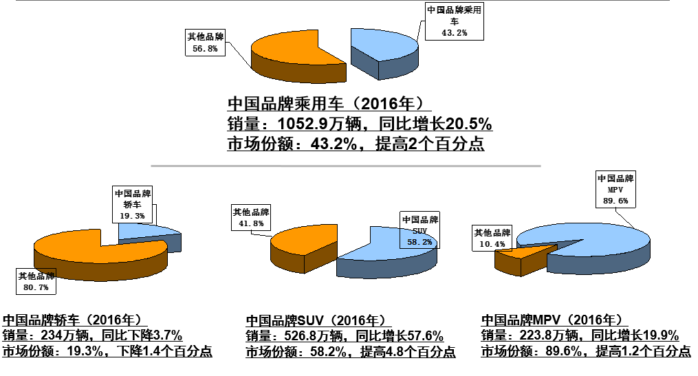 2016年,中国自主品牌乘用车销量为1052.9万辆,同比增长20.5%,市场份额提升2个百分点,达到43.2%,其中,SUV增长迅猛,轿车品牌持续下降。2016年,中国自主SUV共销售526.8万辆,同比增长57.6%,MPV共销售223.8万辆,同比增长19.9%,轿车共销售234万辆,同比下降3.7%。