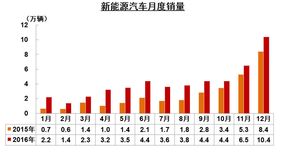 另外,新能源汽车也完成了修订后的50万产销任务。2016年,新能源汽车生产51.7万辆,销售50.7万辆,比上年同期分别增长51.7%和53%。其中纯电动汽车产销分别完成41.7万辆和40.9万辆,比上年同期分别增长63.9%和65.1%;插电式混合动力汽车产销分别完成9.9万辆和9.8万辆,比上年同期分别增长15.7%和17.1%。