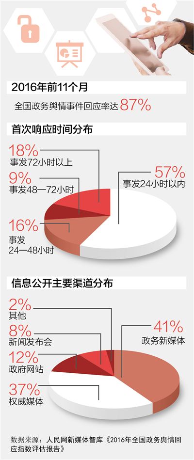 人民网新媒体智库分析显示,2016年1月—11月的600多起舆情案例中,政府回应率达到87%,有57%以上的事件政府首次响应在事发24小时之内,有73%的事件政府部门首次回应在48小时之内(含24小时)。其中,41%的事件通过政务新媒体作出回应(右图)。