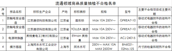 江苏通领科技有限公司生产的GPREA7-10防触电安全插座,不合格项目为移动式电器附件的结构不合格。英特曼电工(常州)有限公司生产的Etman 英特曼ACJ 24015电源插座,不合格项目同样为移动式电器附件的结构不合格。另外,还有一款为上海阿乐乐可工业设计有限公司生产的阿乐乐可BN6021-02No.1ZS电源插座,不合格项目为尺寸的检查和耐热不合格。