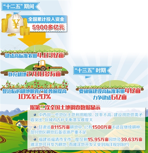 同时,对耕地的建设性保护也迫在眉睫。“建设性保护指通过工程措施改善耕地质量。”中央农办副主任韩俊介绍,近年来,国家大力推进土地整治与高标准农田建设,有效弥补了耕地产能损失。仅高标准农田建设一项,“十二五”期间,全国累计投入资金5900多亿元,建成高标准农田4.03亿亩,补充耕地2700多万亩,整治后的耕地粮食产能普遍提高10%至20%。“十三五”时期,要确保建设高标准农田4亿亩,力争建成6亿亩。