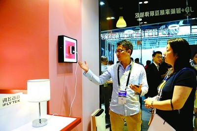 科技为文化产业发展插上新的翅膀,图为观众在智能家居互联体验区参观一款可用手机APP控制的设备。光明图片/视觉中国