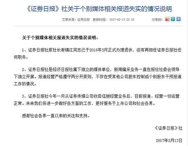 1、证券日报社原社长谢镇江同志已于2016年3月正式办理退休,没有再担任证券日报社任何职务。